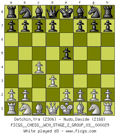 Last move : d3 2026 January 28 2:23:42 White clock - 31 days 18:22:42 Black clock - 30 days 09:31:33 [Event "FICGS__CHESS__WCH_STAGE_2_GROUP_03__000029"] [Site "FICGS"] [Date "2026.01.27"] [Round "1"] [White "Detchin,Yra"] [Black "Nudo,Davide"] [Result "*"] [WhiteElo "2306"] [BlackElo "2168"] 1.c4 e5 2.d3 * Follow this game move after move (download)During a Chess competition a Chessmaster should be a combination of a beast of prey and a monk. (Alexander Alekhine) Offensichtlich kennt Kasparow nichts anderes als Schach, und ich könnte 500 weitere Spieler dieser Sorte benennen. (Judith Polgar) Un Peón pasado es un criminal, quién debe ser mantenido bajo candado y llave. Leves medidas, tales como vigilancia policiaca, no son suficientes. (Aaron Nimzovich) Donnez-moi un Cavalier en 6e et je gagnerais toutes mes parties. (Steinitz) Gambling : The sure way of getting nothing from something. (Wilson Mizner)