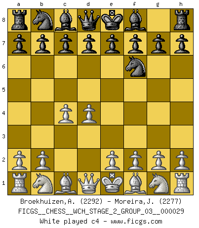 Last move : Nf6 2026 January 28 1:0:29 White clock - 30 days 12:14:44 Black clock - 30 days 17:15:35 [Event "FICGS__CHESS__WCH_STAGE_2_GROUP_03__000029"] [Site "FICGS"] [Date "2026.01.27"] [Round "1"] [White "Broekhuizen,A. T. S."] [Black "Moreira,Jose"] [Result "*"] [WhiteElo "2292"] [BlackElo "2277"] 1.d4 Nf6 2.* Follow this game move after move (download)Your body has to be in top condition. Your Chess deteriorates as your body does. You can't separate body from mind. (Bobby Fischer) Ich las kürzlich ein Buch von Nietzsche. Er sagte Religion verdumme nur die Menschen. Ich stimme zu. (Robert James Fischer) Cuando tu no sabes absolutamente que mas hacer, es tiempo de entrar en pánico. (John van der Wiel) Les Cavaliers se révèlent fort utiles dans les positions fermées. D'habitude, les Fous sont un peu plus forts que les Cavaliers dans les positions ouvertes. Qu'on le veuille ou non, il restera toujours des exceptions ! The worth of a book is to be measured by what you can carry away from it. (James Bryce)