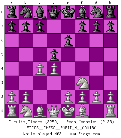 Last move : Nf3 2026 January 27 23:2:5 White clock - 32 days 20:53:19 Black clock - 31 days 20:29:53 [Event "FICGS__CHESS__RAPID_M__000180"] [Site "FICGS"] [Date "2026.01.27"] [Round "1"] [White "Cirulis,Ilmars"] [Black "Pech,Jaroslav"] [Result "*"] [WhiteElo "2250"] [BlackElo "2123"] 1.d4 d5 2.c4 e6 3.Nf3 * Follow this game move after move (download)All I want to do, ever, is just play Chess. (Bobby Fischer) Ein typischer, sehr verbreiteter Gedankenschädling ist der, daß der betreffende Amateur von der Annanhme ausgeht, daß jeder einzelne Zug etwas zu leisten habe. (Aaron Nimzowitsch) Me siento como si fuera una pieza en una partida de Ajedrez, cuando mi oponente me indica: esa pieza no puede ser movida. (Soren Kierkegaard) Nous sommes les pions de la mystérieuse partie d'Echecs jouée par Dieu. Il nous déplace, nous arrête, nous pousse encore, puis nous lance un à un dans la boîte du Néant. Epitaphe sur la tombe de David Janowsky (1868-1927). Hardware: the parts of a computer that can be kicked. (Jeff Persis)