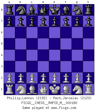 First move 2026 January 27 19:45:11 White clock - 29 days 16:53:50 Black clock - 30 days 00:00:00 [Event "FICGS__CHESS__RAPID_M__000180"] [Site "FICGS"] [Date "2026.01.27"] [Round "1"] [White "Phillip,Lennox"] [Black "Pech,Jaroslav"] [Result "*"] [WhiteElo "2192"] [BlackElo "2123"] 1.* Follow this game move after move (download)I had a toothache during the first game. In the second game I had a headache. In the third game it was an attack of rheumatism. In the fourth game, I wasn't feeling well. And in the fifth game? Well, must one have to win every game ? (Siegbert Tarrasch) Deine Wertungszahl - vorausgesetzt einige Jahre schachliche Anstrengung - entspricht etwa dem zehnfachen Deines IQ plus 1000. (Jonathan Levitt) ¿Se han dado cuenta de que Fischer casi nunca ha tenido piezas malas? El las intercambia y las piezas malas se quedan con sus oponenets. (Yuri Balashov) C'est une question de caractère, Beaucoup de gens perdent leur motivation très vite. D'autres, ils sont rares, peuvent la conserver très longtemps. J'aime les échecs, encore aujourd'hui je suis heureux d'analyser des parties. J'aime toujours gagner, je déteste encore perdre. Bien jouer est important pour mon intégrité intellectuelle et morale. Et puis les échecs vivent en ce moment une période historique grâce à Internet. Ils se développent dans les systèmes éducatifs à travers le monde. Ils sortent de leur ghetto, et c'est mon rôle de mener à bien cette révolution. (Gary Kasparov) You can't play chess if you're groggy from pills. (Anatoly Karpov)