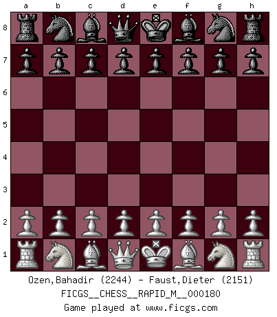 First move 2026 January 27 19:45:11 Bahadir Ozen ... is in vacation until 2026 January 30 10:44:16 White clock - 30 days 00:00:00 Black clock - 30 days 00:00:00 [Event "FICGS__CHESS__RAPID_M__000180"] [Site "FICGS"] [Date "2026.01.27"] [Round "1"] [White "Ozen,Bahadir"] [Black "Faust,Dieter"] [Result "*"] [WhiteElo "2244"] [BlackElo "2151"] 1.* Follow this game move after move (download)All I want to do, ever, is just play Chess. (Bobby Fischer) Man wirke der falschen Auffassung entgegen, als ob jeder Zug Unmittelbares zu leisten habe; auch Werte- und Ruhezüge haben ihre Existenzberechtigung. (Aaron Nimzowitsch) El Ajedrez es parte de la cultura, y si una cultura esta en decadencia, entonces también el Ajedrez declinará. (Mikhail Botvinnik) Une platitude souvent récitée à propos des Echecs est qu'une des choses les plus difficiles à réaliser est de gagner une position gagnante. Cela ne manque pas de sens mais, pour ma part, j'ai toujours trouvé plus difficile de gagner une position perdante. (Tim Krabbe) Now be brave and don't look back. Don't look back. (Shmi Skywalker in Star Wars ep.1)