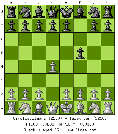 Last move : f5 2026 January 28 0:15:31 White clock - 30 days 21:36:48 Black clock - 30 days 21:25:36 [Event "FICGS__CHESS__RAPID_M__000180"] [Site "FICGS"] [Date "2026.01.27"] [Round "1"] [White "Cirulis,Ilmars"] [Black "Talek,Jan"] [Result "*"] [WhiteElo "2250"] [BlackElo "2210"] 1.d4 f5 2.* Follow this game move after move (download)Chess is a fighting game which is purely intellectual and includes chance. (Richard Reti) Korrekt heißt in Deutschland die Haltung eines Mannes, dessen Benehmen nach dem Urteile seiner Nachbarn seiner Stellung angemessen ist. Um korrekt zu sein, muß man sich der Meinung der anderen anpassen... (Emanuel Lasker) Fischer deseaba darle a los Rusos una sopa de su propia medicina. (Larry Evans) Des idées, des idées, j'en ai cent, j'en ai mille. Des bonnes, des mauvaises, applicables, irréalisables... Il suffit de faire le tri ! (Roos) Whoever said the pen is mightier than the sword obviously never encountered automatic weapons. (US General Douglas MacArthur)