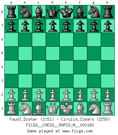 First move 2026 January 27 19:45:11 White clock - 29 days 17:23:12 Black clock - 30 days 00:00:00 [Event "FICGS__CHESS__RAPID_M__000180"] [Site "FICGS"] [Date "2026.01.27"] [Round "1"] [White "Faust,Dieter"] [Black "Cirulis,Ilmars"] [Result "*"] [WhiteElo "2151"] [BlackElo "2250"] 1.* Follow this game move after move (download)Kasparov : J'adoube , Ivanchuk : S'il vous plaît ! (Garry Kasparov & Vassily Ivanchuk, Linares 1997) Wenn ich einen Club besuche, sind die Spieler stumm vor Staunen. (José Raúl Capablanca) Algunos sacrificios son sólidos, los demás son mÃos. (Mikhail Tal) Les échecs c'est le défi de l'alpiniste, toujours plus haut, prêt à tout pour monter à l'assaut du Roi ennemi. Les échecs, c'est de la musique en mouvement, un ballet majestueux pour les yeux. C'est de la poésie composée par les fantômes du passé qui au même titre que Rimbaud ou Verlaine méritent notre admiration. Les échecs, c'est de la peinture ou le moindre mouvement modifie le tableau pour en faire un Picasso ou un Van Gogh. Les échecs, c'est tout et rien, c'est la vie et la mort. Jjulie33 sur le forum de France-Echecs. To err is human, but to really foul things up requires a computer. (Farmer's Almanac, 1978)