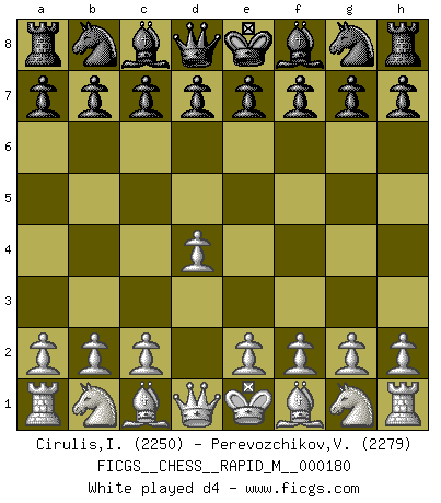 Last move : d4 2026 January 27 21:41:18 White clock - 30 days 22:03:53 Black clock - 29 days 18:01:43 [Event "FICGS__CHESS__RAPID_M__000180"] [Site "FICGS"] [Date "2026.01.27"] [Round "1"] [White "Cirulis,Ilmars"] [Black "Perevozchikov,Vjacheslav"] [Result "*"] [WhiteElo "2250"] [BlackElo "2279"] 1.d4 * Follow this game move after move (download)A bad plan is better than none at all. (Frank Marshall) Alles was am Schachbrett zählt sind gute Züge. (Robert James Fischer) Botvinnik trató de alejar el misterio referente al Ajedrez, siempre relacionandolo a situaciones de la vida diaria. Solía llamar al Ajedrez un problema inexacto típico, similar a aquellos en que la gente tiene siempre que resolver a cada día. (Garry Kasparov) Un journaliste : 'Vous préférez avoir une dame de plus sur l'échiquier ou au lit ?' Boris Spassky : 'Ca dépend de la position.' All the biggest technological inventions created by man - the airplane, the automobile, the computer - says little about his intelligence, but speaks volumes about his laziness. (Mark Kennedy)