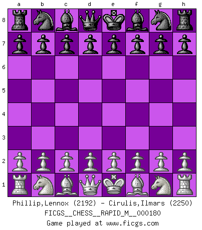 First move 2026 January 27 19:45:11 White clock - 29 days 17:23:12 Black clock - 30 days 00:00:00 [Event "FICGS__CHESS__RAPID_M__000180"] [Site "FICGS"] [Date "2026.01.27"] [Round "1"] [White "Phillip,Lennox"] [Black "Cirulis,Ilmars"] [Result "*"] [WhiteElo "2192"] [BlackElo "2250"] 1.* Follow this game move after move (download)Place the contents of the Chess box in a hat, shake them up vigorously, pour them on the board from a height of two feet, and you get the style of Steinitz. (H. E. Bird) Kein Schachspieler kann gut schlafen. (H. G. Wells) No hay precio que no valga la pena por la cabellera del Rey enemigo. (Koblentz) Toutes les manuvres exécutées sur une colonne ouverte ont pour but ultime l'intrusion définitive sur la septième ou la huitième rangée, en plein cur de la position ennemie. (Aaron Nimzovitch) I couldn't make any sense out of what this particular thread is about. It sounds like R2 D2 computer speaking. A space fight ?!? Some 'command' problems in Moscow ? Some killers & narcotic addicts attacking some game & a god wannabe ?? (Dinesh De Silva, lost in a russian conflict in FICGS forum)