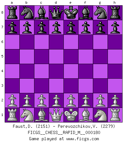 First move 2026 January 27 19:45:11 White clock - 29 days 17:23:12 Black clock - 30 days 00:00:00 [Event "FICGS__CHESS__RAPID_M__000180"] [Site "FICGS"] [Date "2026.01.27"] [Round "1"] [White "Faust,Dieter"] [Black "Perevozchikov,Vjacheslav"] [Result "*"] [WhiteElo "2151"] [BlackElo "2279"] 1.* Follow this game move after move (download)In order to improve your game, you must study the endgame before everything else, for whereas the endings can be studied and mastered by themselves, the middle game and the opening must be studied in relation to the endgame. (Jose Raul Capablanca) Sicherlich können nur Meister einen Stil haben. Daß ein nicht-Meister auch nur ein einziges Mal in seinem Leben eine Partie folgerecht durchführte, habe ich niemals bemerkt. (Emanuel Lasker) Un entendimiento minucioso de las típicas continuaciones de mate hacen de las mas complicadas combinaciones de sacrificio que conducen hacia ellas no solo no dificiles, sino casi un asunto de rutina. (Siegbert Tarrasch) Il (Jacob Murray) ne joue pas pour le bon coup, mais pour le meilleur. (Eloi Relange) Man is reluctant to give credit for intelligence to anyone, except his enemies. (Albert Einstein)