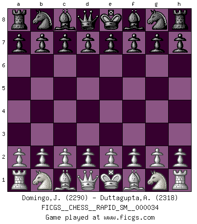 First move 2026 January 28 21:7:12 White clock - 29 days 18:36:29 Black clock - 30 days 00:00:00 [Event "FICGS__CHESS__RAPID_SM__000034"] [Site "FICGS"] [Date "2026.01.28"] [Round "1"] [White "Domingo,Jordi"] [Black "Duttagupta,Aniruddha"] [Result "*"] [WhiteElo "2290"] [BlackElo "2318"] 1.* Follow this game move after move (download)Different people feel differently about resigning. (Bobby Fischer) Ein typischer, sehr verbreiteter Gedankenschädling ist der, daß der betreffende Amateur von der Annanhme ausgeht, daß jeder einzelne Zug etwas zu leisten habe. (Aaron Nimzowitsch) El Ajedrez es un cuento de Hadas de las 1001 metidas de pata. (Savielly Tartakower) Des idées, des idées, j'en ai cent, j'en ai mille. Des bonnes, des mauvaises, applicables, irréalisables... Il suffit de faire le tri ! (Roos) Plans are ideas that never come to fruition. (Daniel Parmet)