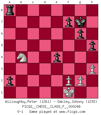 Last move : 0-1 2007 November 5 23:15:59 [Event "FICGS__CHESS__CLASS_F__000048"] [Site "FICGS"] [Date "2007.10.12"] [Round "1"] [White "Willoughby,Peter"] [Black "Oakley,Johnny"] [Result "0-1"] [WhiteElo "1261"] [BlackElo "1292"] 1.e4 d5 2.exd5 Nf6 3.Bb5+ Bd7 4.Bc4 b5 5.Bb3 Na6 6.Nc3 Nc5 7.Nge2 Nxb3 8.axb3 b4 9.Na2 Nxd5 10.c4 bxc3 11.bxc3 e5 12.c4 Nf6 13.Nac3 Bc5 14.O-O O-O 15.Ba3 Be7 16.Nb5 Bxb5 17.cxb5 Bxa3 18.Rxa3 Qd3 19.Nc1 Qxb5 20.d4 Qb4 21.Ra4 Qd6 22.Ne2 Nd5 23.Re1 Rfe8 24.Ng3 Nc3 25.Qa1 Nxa4 26.Qxa4 Qxd4 27.Nf5 Qxa4 28.bxa4 Rab8 29.h3 Rb4 30.a5 Ra4 31.Rc1 g6 32.Nh6+ Kg7 33.Ng4 Rxa5 34.Rxc7 h5 35.Ne3 Ra8 36.Nc4 Ra1+ 37.Kh2 Rc1 38.Rc6 e4 39.Ne5 Rxc6 40.Nxc6 a5 41.Kg1 a4 42.Kf1 a3 43.Nb4 a2 0-1 Scandinavian defense Kingside Castling by player White (move 14) Kingside Castling by player Black (move 14) Player Black won this chess game. Follow this game move after move (download)If one piece is badly posted, the whole game is bad. (Tarrasch) Ivan Sokolov treibt mich als Beifahrer an mit go Loeky go - . (Loek van Wely) Un entendimiento a fondo de las continuaciones típicas del mate, hace de las combinaciones de sacrificio mas complicadas conducirlas a ellas no solo sin dificultad, sino casi de una manera natural. (Siegbert Tarrasch) Les Echecs sont affaire de jugement sensible. Savoir quand frapper et quand esquiver. (Fischer) . 'gn is not allowed in chess unless n is an integer between 1 and 8 inclusive, where 1 and 8 are to interpreted as the standard numerals standing for integers in the ordered real-closed field R, with the *canonical* ordering. (As opposed to, say, an integer in the domain Z[2+i*sqrt(5)] or an integer in some exotic Grothendieck topos). (Normajean Yates)
