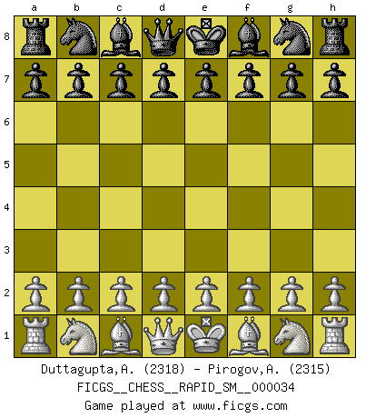 First move 2026 January 28 21:7:12 White clock - 29 days 18:35:46 Black clock - 30 days 00:00:00 [Event "FICGS__CHESS__RAPID_SM__000034"] [Site "FICGS"] [Date "2026.01.28"] [Round "1"] [White "Duttagupta,Aniruddha"] [Black "Pirogov,Andrey Mikhaylovich"] [Result "*"] [WhiteElo "2318"] [BlackElo "2315"] 1.* Follow this game move after move (download)Good positions don't win games, good moves do. (Gerald Abrahams) Ein Schachgenie ist jemand der verdammt gut Schach spielt. (Jonathan Levitt) ¿Se han dado cuenta de que Fischer casi nunca ha tenido piezas malas? El las intercambia y las piezas malas se quedan con sus oponenets. (Yuri Balashov) Pour moi, les échecs ne sont pas un jeu mais un art. (Alexandre Alekhine) Wisdom is the reward you get for a lifetime of listening when you'd have preferred to talk. (Doug Larson)