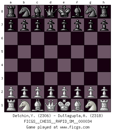 First move 2026 January 28 21:7:12 White clock - 29 days 18:35:45 Black clock - 30 days 00:00:00 [Event "FICGS__CHESS__RAPID_SM__000034"] [Site "FICGS"] [Date "2026.01.28"] [Round "1"] [White "Detchin,Yra"] [Black "Duttagupta,Aniruddha"] [Result "*"] [WhiteElo "2306"] [BlackElo "2318"] 1.* Follow this game move after move (download)When you absolutely don't know what to do anymore, it is time to panic. (John van der Wiel) Es gibt zwei Arten von Opfern: Korrekte und meine. (Mikhail Nekhemyevich Tal) Cuando estes solo, cuando te sientas un extraño en el mundo, juega al Ajedrez. Esto levantará tu espiritu y será tu consejero de guerra. (Aristóteles) Mais l'homme est une créature légère et illogique : semblable au joueur d'échecs, il n'aime que le processus du but à atteindre, non le but lui-même. (Dostoïevsky) Men never do evil so completely and cheerfully as when they do it from religious conviction. (Blaise Pascal)