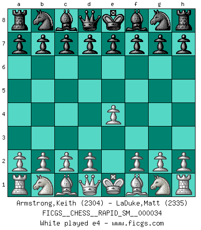 Last move : e4 2026 January 28 21:29:6 White clock - 30 days 23:38:06 Black clock - 29 days 18:58:23 [Event "FICGS__CHESS__RAPID_SM__000034"] [Site "FICGS"] [Date "2026.01.28"] [Round "1"] [White "Armstrong,Keith"] [Black "LaDuke,Matt"] [Result "*"] [WhiteElo "2304"] [BlackElo "2335"] 1.e4 * Follow this game move after move (download)Could we look into the head of a Chess player, we should see there a whole world of feelings, images, ideas, emotion and passion. (Alfred Binet) Es hat in meinem Leben Zeiten gegeben, in denen das Schachspiel, wenn nicht zum Lebenszweck, so doch zu einem regelrechten Lebensersatz geworden ist. Man fühlt sich in solchen Zeiten nicht so, als besäße man eine göttliche Gabe, sondern eher so, als sei man von ihr besessen. (Garry Kasparov) Las piezas de Ajedrez son los bloques del alfabeto que moldean los pensamientos; y esos pensamientos, aunque hagan un diseño visual en el tablero, expresan abstractamente su belleza como un poema. (Marcel Duchamp) La victoire dans une partie d'Echecs appartient la plupart du temps à celui qui voit un peu plus loin que l'adversaire. (Lasker) Unless I accept my faults I will most certainly doubt my virtues. (Hugh Prather)