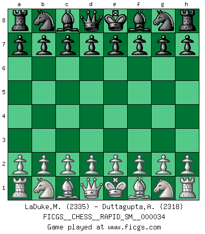 First move 2026 January 28 21:7:12 White clock - 29 days 18:35:50 Black clock - 30 days 00:00:00 [Event "FICGS__CHESS__RAPID_SM__000034"] [Site "FICGS"] [Date "2026.01.28"] [Round "1"] [White "LaDuke,Matt"] [Black "Duttagupta,Aniruddha"] [Result "*"] [WhiteElo "2335"] [BlackElo "2318"] 1.* Follow this game move after move (download)Fischer, who may or may not be mad as a hatter, has every right to be horrified. (Jeremy Silman) Ich glaube nicht an Psychologie, ich glaube an gute Züge. (Robert James Fischer) Los tropiezos estan todos ahí en el tablero, esperando que se cometan. (Savielly Tartakover) Aucun coup ne doit être joué sans but. (Pedro Damiano) The absolute truth is the thing that makes people laugh. (Carl Reiner)