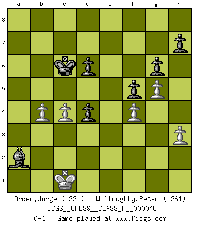 Last move : 0-1 2007 November 10 16:4:33 [Event "FICGS__CHESS__CLASS_F__000048"] [Site "FICGS"] [Date "2007.10.12"] [Round "1"] [White "Orden,Jorge"] [Black "Willoughby,Peter"] [Result "0-1"] [WhiteElo "1221"] [BlackElo "1261"] 1.e4 e6 2.Nf3 d5 3.exd5 exd5 4.d4 Nf6 5.Bd3 Bd6 6.O-O O-O 7.h3 Nc6 8.Re1 Nh5 9.Ne5 Nf6 10.Nxc6 bxc6 11.Bg5 c5 12.Bxf6 Qxf6 13.Na3 Qf4 14.g3 Qxd4 15.Nb5 Qf6 16.Nxd6 cxd6 17.Qh5 g6 18.Qxd5 Be6 19.Qe4 Rae8 20.Bb5 Rb8 21.Bc4 Bxc4 22.b3 Be6 23.c4 Rfe8 24.Qg2 a5 25.Rad1 Bd7 26.f4 Rxe1+ 27.Rxe1 Re8 28.Rxe8+ Bxe8 29.Qd2 Qd4+ 30.Qxd4 cxd4 31.Kf2 Bd7 32.g4 f5 33.g5 Bc6 34.Ke2 Be4 35.a3 Kf7 36.b4 axb4 37.axb4 Ke7 38.Kd2 Kd7 39.Ke2 Kc6 40.Kd2 Bb1 41.Kc1 Ba2 0-1 French defense Kingside Castling by player White (move 6) Kingside Castling by player Black (move 6) Player Black won this chess game. Follow this game move after move (download)Fischer is completely natural. He plays no roles. He's like a child. Very, very simple. (Zita Rajcsanyi) Ich kenne Menschen, die allen Willen der Welt besitzen und doch nicht Schach spielen können. (Robert James Fischer) El Ajedrez, como la música, como el amor, tiene el poder de hacer feliz a la gente. (Siegbert Tarrasch) Karpov est une pièce de musée. (Garry Kasparov) Games, world of games... There's always an opponent, and there's always a victim. (Revolver, movie)