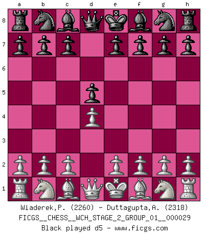 Last move : d5 2026 January 31 19:53:2 White clock - 29 days 12:19:54 Black clock - 30 days 23:33:51 [Event "FICGS__CHESS__WCH_STAGE_2_GROUP_01__000029"] [Site "FICGS"] [Date "2026.01.31"] [Round "2"] [White "Wiaderek,Piotr"] [Black "Duttagupta,Aniruddha"] [Result "*"] [WhiteElo "2260"] [BlackElo "2318"] 1.d4 d5 2.* Follow this game move after move (download)Chess is ruthless: you've got to be prepared to kill people. (Nigel Short) Wenn du nicht weißt was du tun sollst, warte bis dein Gegner eine Idee hat. Sie wird sicher schlecht sein. (Siegbert Tarrasch) En la vida, como en el Ajedrez, los Peones propios obstruyen nuestro camino. La gran fortuna de un hombre, su comodidad, placer, hijos, libros, que deberían ayudarle a ganar, con mucha frecuencia lo ponen en Jaque Mate. (Charles Buxton) Aux échecs, l'amour-propre est satisfait quand on remporte la victoire, mais il n'y a pas de honte à être battu. (Benjamin Franklin) Drag your thoughts away from your troubles... by the ears, by the heels, or any other way you can manage it. (Mark Twain)