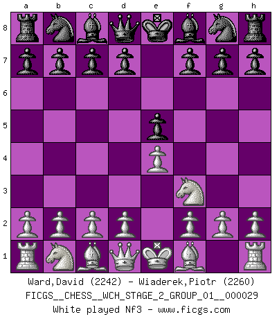 Last move : Nf3 2026 January 31 21:53:13 White clock - 31 days 21:24:58 Black clock - 30 days 05:04:58 [Event "FICGS__CHESS__WCH_STAGE_2_GROUP_01__000029"] [Site "FICGS"] [Date "2026.01.31"] [Round "2"] [White "Ward,David"] [Black "Wiaderek,Piotr"] [Result "*"] [WhiteElo "2242"] [BlackElo "2260"] 1.e4 e5 2.Nf3 * Follow this game move after move (download)At this time Fischer is simply a level above all the best Chessplayers in the world. (John Jacobs) Im Schach gibt es keinen Platz für Galanterie. (Irving Chernev) El poder defensivo de una pieza clavada, solamente es imaginario. (Aaron Nimzovich) La solitude du joueur d'Echecs à l'approche du mat est semblable à celle du condamné. (Francis Szpiner) The right perception of any matter and a misunderstanding of the same matter do not wholly exclude each other. (Kafka's the trial)