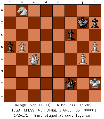 Last move : 1/2-1/2 2006 September 8 17:36:31 [Event "FICGS__CHESS__WCH_STAGE_1_GROUP_06__000001"] [Site "FICGS"] [Date "2006.07.01"] [Round "1"] [White "Balogh,Ivan"] [Black "Riha,Josef"] [Result "1/2-1/2"] [WhiteElo "1700"] [BlackElo "1592"] 1.c4 e5 2.Nc3 Bb4 3.Nd5 Be7 4.d4 d6 5.e4 Nf6 6.Nxe7 Qxe7 7.f3 exd4 8.Qxd4 Nc6 9.Qc3 O-O 10.Ne2 Nd7 11.Nf4 Nc5 12.Nd5 Qh4+ 13.g3 Qd8 14.Be3 f5 15.b4 Nd7 16.exf5 a5 17.b5 Nb4 18.g4 c6 19.Nf4 Re8 20.Kf2 Ne5 21.h4 Qf6 22.Bd2 Bd7 23.a3 cxb5 24.Re1 Na6 25.cxb5 Nc5 26.Nd5 Qf8 27.Nb6 Rab8 28.Kg3 Kh8 29.Be3 Nxf3 30.Bxc5 Nxe1 31.Nxd7 Qf7 32.Nxb8 dxc5 33.f6 Re4 34.Be2 Rxe2 35.Rxe1 Rxe1 36.Qxe1 gxf6 37.Qe4 c4 38.h5 Qf8 39.Qxb7 Qd6+ 40.Kh3 Qxa3+ 41.Kh4 Qe3 42.Qc8+ Kg7 43.Qxc4 Qf2+ 44.Kh3 Qf3+ 45.Kh2 Qf2+ 46.Kh1 Qf3+ 47.Kh2 Qf2+ 1/2-1/2 English, Kramnik-Shirov counterattack Kingside Castling by player Black (move 9) This chess game ended in a draw. Follow this game move after move (download)By this measure (on the gap between Fischer & his contemporaries), I consider him the greatest world champion. (Garry Kasparov) Das Schachspiel ist ein See, in welchem eine Mücke baden und ein Elefant ertrinken kann. (Emanuel Lasker) Observen a Garry Kasparov. Después de una derrota, invariablemente el gana la próxima partida. Prácticamente hace pedazos a su siguiente oponente. Eso es algo que tenemos que aprender a lograr. (Maurice Ashley) Toute estimation doit être constamment réévaluée. (Jacob Estrin) Wisdom doesn't necessarily come with age. Sometimes age just shows up all by itself. (Tom Wilson)