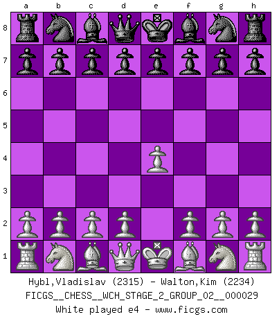 Last move : e4 2026 January 31 14:25:55 White clock - 30 days 10:29:03 Black clock - 29 days 18:35:37 [Event "FICGS__CHESS__WCH_STAGE_2_GROUP_02__000029"] [Site "FICGS"] [Date "2026.01.31"] [Round "2"] [White "Hybl,Vladislav"] [Black "Walton,Kim"] [Result "*"] [WhiteElo "2315"] [BlackElo "2234"] 1.e4 * Follow this game move after move (download)By this measure (on the gap between Fischer & his contemporaries), I consider him the greatest world champion. (Garry Kasparov) Das Schachspiel ist ein See, in welchem eine Mücke baden und ein Elefant ertrinken kann. (Emanuel Lasker) No solamente yo pronostico su triunfo sobre Botvinnik, sino que me adelanto y digo que probablemente Fischer es el jugador de Ajedrez mas grande que haya existido. (John Collins) Les échecs sont un jeu par leur forme, un art par leur essence et une science par sa difficulté d'acquisition. Ils peuvent vous procurer autant de plaisir qu'un bon livre ou une belle musique, mais vous n'aurez une réelle joie que si vous arrivez à bien jouer. (Tigran Petrosian) He who fights with monsters should be careful lest he thereby become a monster. (Friedrich Nietzsche, Beyond Good and Evil)