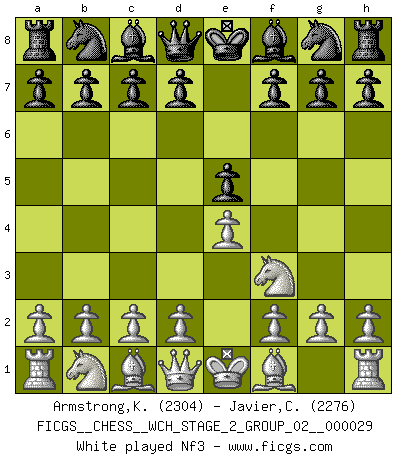 Last move : Nf3 2026 January 31 11:16:28 White clock - 31 days 21:34:21 Black clock - 30 days 10:30:17 [Event "FICGS__CHESS__WCH_STAGE_2_GROUP_02__000029"] [Site "FICGS"] [Date "2026.01.31"] [Round "2"] [White "Armstrong,Keith"] [Black "Javier,Christian"] [Result "*"] [WhiteElo "2304"] [BlackElo "2276"] 1.e4 e5 2.Nf3 * Follow this game move after move (download)Of Chess it has been said that life is not long enough for it, but that is the fault of life, not Chess. (William Ewart Napier) In der Schule lernt man nichts. Es ist nur Zeitverschwendung. (Robert James Fischer) Existen dos clases de sacrificios: los correctos y los míos. (Mikhail Tal) Toutes choses étant égales, c'est la conviction qui gagne. Alliée à une volonté de vaincre, elle sert de détonateur, suscite des idées, disperse les doutes et aide à penser clairement. (Robert Fischer) Internet: Absolute communication, absolute isolation. (Paul Carvel)