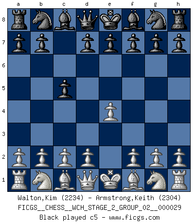 Last move : c5 2026 January 31 2:54:7 White clock - 30 days 09:52:24 Black clock - 30 days 23:48:14 [Event "FICGS__CHESS__WCH_STAGE_2_GROUP_02__000029"] [Site "FICGS"] [Date "2026.01.31"] [Round "2"] [White "Walton,Kim"] [Black "Armstrong,Keith"] [Result "*"] [WhiteElo "2234"] [BlackElo "2304"] 1.e4 c5 2.* Follow this game move after move (download)Only sissies Castle. (Rob Sillars) Die Neutralität betrachte ich als eine schwere Krankheit. (Viktor Kortschnoi) Bobby solo arroja las piezas y solas caen en las casillas correctas. (Miguel Najdorf ) Il n'y a plus de joueurs du niveau de Jacob Murray dont la seule quête est le beau jeu, le plaisir de voir les pièces construire quelque chose. Sur 10 idées à la minute, 9 seront sans intérêt, la dernière s'avèrera géniale. (Christian Bauer) Never was anything great achieved without danger. (Niccolo Machiavelli)