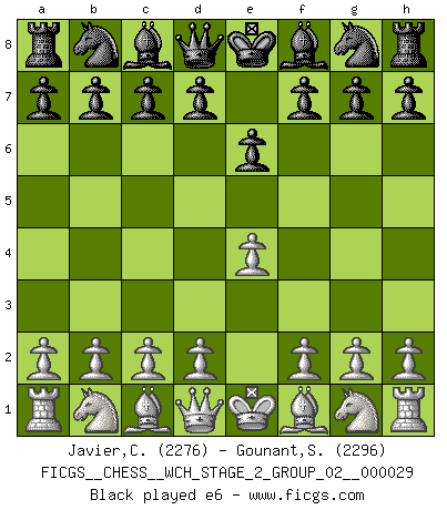 Last move : e6 2026 January 31 11:49:49 White clock - 30 days 13:40:43 Black clock - 30 days 21:36:06 [Event "FICGS__CHESS__WCH_STAGE_2_GROUP_02__000029"] [Site "FICGS"] [Date "2026.01.31"] [Round "2"] [White "Javier,Christian"] [Black "Gounant,Stanislas"] [Result "*"] [WhiteElo "2276"] [BlackElo "2296"] 1.e4 e6 2.* Follow this game move after move (download)Fischer is under obligation to nobody. (Joseph Platz) Stil? Ich habe keinen Stil! (Anatoly Karpov) El Ajedrez es parte de una cultura y si una cultura esta en decadencia, entonces también el Ajedrez declinará. (Mikhail Botvinnik) La victoire dans une partie d'Echecs appartient la plupart du temps à celui qui voit un peu plus loin que l'adversaire. (Lasker) The only sure thing about luck is that it will change. (Wilson Mizner)