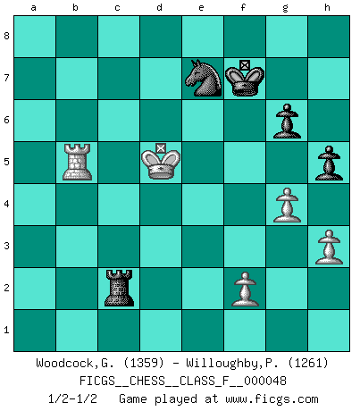 Last move : 1/2-1/2 2008 March 6 19:32:51 [Event "FICGS__CHESS__CLASS_F__000048"] [Site "FICGS"] [Date "2007.10.12"] [Round "1"] [White "Woodcock,Graham"] [Black "Willoughby,Peter"] [Result "1/2-1/2"] [WhiteElo "1359"] [BlackElo "1261"] 1.d4 f5 2.e3 Nf6 3.c4 e6 4.g3 g6 5.Bg2 Bg7 6.Nf3 O-O 7.O-O Nc6 8.Qb3 a5 9.Nc3 d5 10.cxd5 exd5 11.Nd2 b6 12.Nxd5 Be6 13.Qc4 Bxd5 14.Bxd5+ Qxd5 15.Qxd5+ Nxd5 16.b3 Ndb4 17.Bb2 a4 18.Rac1 axb3 19.axb3 Ra2 20.Bc3 Nd3 21.Rcd1 b5 22.Ra1 Ncb4 23.Rxa2 Nxa2 24.Ba5 c5 25.dxc5 Nac1 26.b4 Ne2+ 27.Kg2 Nc3 28.h3 Nd5 29.Rb1 Bc3 30.Nb3 Bxb4 31.Bxb4 N3xb4 32.Nd4 Rb8 33.c6 Rc8 34.Rc1 Ne7 35.Rc5 Nbxc6 36.Nxc6 Rxc6 37.Rxb5 h5 38.Kf3 Kf7 39.e4 fxe4+ 40.Kxe4 Nf5 41.Kd5 Rc2 42.g4 Ne7+ 1/2-1/2 Dutch Kingside Castling by player Black (move 6) Kingside Castling by player White (move 7) 10 pieces endgame at move 40 : White KRPPP , Black KRNPP WHITE : King + 1 Rook 3 Pawns BLACK : King + 1 Rook 1 Knight 2 Pawns This chess game ended in a draw. Follow this game move after move (download)Modern Chess is too much concerned with things like Pawn structure. Forget it, Checkmate ends the game. (Nigel Short) Ein bischen Romantik kann weder im Schach noch in der Liebe schaden. Also versuche ich mich ab und zu daran zu erinnern. (Nigel Short) Los Peones son nacidos libres, y aún así, se encuentran encadenados por todos lados. (Rick Kennedy) Le génie consiste à savoir transgresser les règles au moment opportun. (Teichmann) Lottery : A tax on people who are bad at math. (Author unknown)