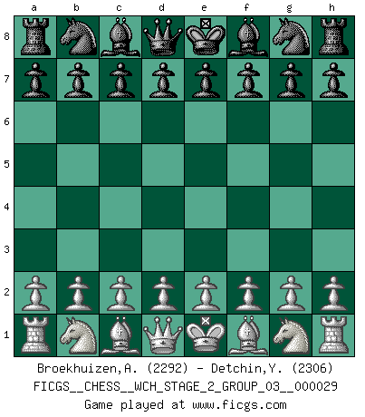 First move 2026 January 31 0:54:59 White clock - 29 days 17:02:01 Black clock - 30 days 00:00:00 [Event "FICGS__CHESS__WCH_STAGE_2_GROUP_03__000029"] [Site "FICGS"] [Date "2026.01.31"] [Round "2"] [White "Broekhuizen,A. T. S."] [Black "Detchin,Yra"] [Result "*"] [WhiteElo "2292"] [BlackElo "2306"] 1.* Follow this game move after move (download)Some sacrifices are sound; the rest are mine. (Mikhail Tal) Ein unbeabsichtigtes Patt ist der Gipfel der Dummheit. (Anonymous) La señal de un Gran Maestro es su habilidad de ganar una partida rápidamente y sin dolor. (Irving Chernev) Nous vivons dans un monde échiquéen : chaque jour qui passe est un défi à relever. (Philosophe Sasha) You know what they say : You lie down with the Devil, you wake up in Hell. (Horatio Caine, C.S.I. Miami)