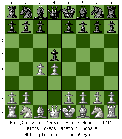 Last move : c4 2026 January 31 6:44:36 White clock - 31 days 20:16:05 Black clock - 30 days 17:09:09 [Event "FICGS__CHESS__RAPID_C__000315"] [Site "FICGS"] [Date "2026.01.31"] [Round "1"] [White "Paul,Samagata"] [Black "Pintor,Manuel"] [Result "*"] [WhiteElo "1705"] [BlackElo "1744"] 1.d4 d5 2.c4 * Follow this game move after move (download)It is always better to sacrifice your opponent's men. (Savielly Tartakower) Ich bin der einzige Schachspieler, der sich während der Vorbereitungen zum Turnier verletzt hat. (Woody Allen) No soy una persona materialista y por eso, no resiento la falta o pérdida del dinero. La ausencia de cosas mundanas carece de importancia. Ya que el Ajedrez es una forma en la que puedo ser tan materialista como yo desee sin tener la necesidad de vender mi alma. (Jamie Walter Adams) On n'a jamais que l'âge auquel on a commence à jouer aux échecs car après on cesse de vieillir. (Capablanca) When I took office, only high energy physicists had ever heard of what is called the World Wide Web... Now even my cat has its own page. (Bill Clinton, 1996)