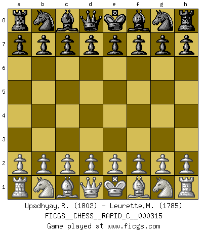 First move 2026 January 31 2:3:54 White clock - 29 days 12:25:45 Black clock - 30 days 00:00:00 [Event "FICGS__CHESS__RAPID_C__000315"] [Site "FICGS"] [Date "2026.01.31"] [Round "1"] [White "Upadhyay,Rajesh"] [Black "Leurette,Marc-Antoine"] [Result "*"] [WhiteElo "1802"] [BlackElo "1785"] 1.* Follow this game move after move (download)Chess is a sea in which a gnat may drink and an elephant may bathe. (Hindu proverb) Fischer: 'Remis!?' Uhlmann: 'Aber es muss doch dreimal Zugwiederholung sein!' Fischer: 'Sie nehmen das Remis an, wie ich es sage, sonst spiele ich weiter und werde Sie dann schlagen!' (Robert James Fischer) Las leyes del Ajedrez no permiten una libre elección: tienes que mover quieras o no. (Emanuel Lasker) Mais l'homme est une créature légère et illogique : semblable au joueur d'échecs, il n'aime que le processus du but à atteindre, non le but lui-même. (Dostoïevsky) A generalist learns less and less about more and more until he knows nothing about everything. (Author unknown)