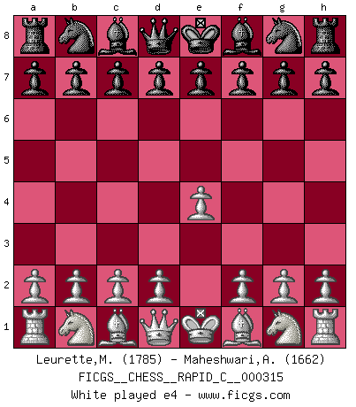 Last move : e4 2026 January 31 10:12:22 White clock - 30 days 15:51:32 Black clock - 29 days 20:34:13 [Event "FICGS__CHESS__RAPID_C__000315"] [Site "FICGS"] [Date "2026.01.31"] [Round "1"] [White "Leurette,Marc-Antoine"] [Black "Maheshwari,Alokik"] [Result "*"] [WhiteElo "1785"] [BlackElo "1662"] 1.e4 * Follow this game move after move (download)For me, Chess is life and every game is like a new life. Every Chess player gets to live many lives in one lifetime. (Eduard Gufeld) Wir können eben der zündenden Macht des Opfers nicht wiederstehen, denn die Begeisterung für das Opfer liegt in der Natur des Menschen. (Rudolf Spielmann) Yo considero que Fischer es uno de los expertos mas grandes de aperturas de siempre. (Keith Hayward) Les écrivains ont utilisé les échecs pour analyser les côtés extrêmes de la nature humaine. Dans ce cadre, les échecs offrent un champ d'expérimentation idéal. Mais on pourrait faire la même chose avec la peinture. Et là, en vous référant à Van Gogh, vous ne tirerez pas de conclusion définitive sur les peintres. (Gary Kasparov) Your best chance to get a Royal Flush in a casino is in the bathroom. (Anonymous)