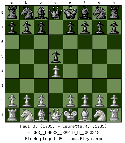 Last move : d5 2026 January 31 10:12:14 White clock - 30 days 18:52:11 Black clock - 30 days 17:33:33 [Event "FICGS__CHESS__RAPID_C__000315"] [Site "FICGS"] [Date "2026.01.31"] [Round "1"] [White "Paul,Samagata"] [Black "Leurette,Marc-Antoine"] [Result "*"] [WhiteElo "1705"] [BlackElo "1785"] 1.d4 d5 2.* Follow this game move after move (download)In the perfect Chess combination as in a first-rate short story, the whole plot and counter-plot should lead up to a striking finale, the interest not being allayed until the very last moment. (Yates and Winter) Es ist nicht das erste mal, dass sich die FIDE dem Arabischen Geld gebeugt hat (über die FIDE WM 2004 in Lybien). (Larry Evans) Por esta medida (el intervalo entre Fischer y sus contemporaneos), yo le considero el mas grande campeón mundial. (Garry Kasparov) Il a essayé de se convaincre qu'il pourrait empêcher toutes les erreurs et ne jamais perdre. L'horreur ! Gary Kasparov au sujet de Robert Fischer. When you have everything, sometimes it feels like nothing. (Horatio Caine, C.S.I. Miami)