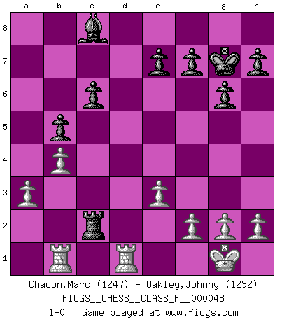 Last move : 1-0 2007 November 20 5:50:15 [Event "FICGS__CHESS__CLASS_F__000048"] [Site "FICGS"] [Date "2007.10.12"] [Round "1"] [White "Chacon,Marc"] [Black "Oakley,Johnny"] [Result "1-0"] [WhiteElo "1247"] [BlackElo "1292"] 1.d4 Nf6 2.c4 g6 3.Nf3 d5 4.Nc3 Bg7 5.e3 O-O 6.Be2 dxc4 7.Bxc4 c5 8.O-O cxd4 9.Nxd4 Qc7 10.Be2 Rd8 11.Ncb5 Qc5 12.Qc2 Qxc2 13.Nxc2 Ne4 14.Nc7 Bf5 15.Nxa8 Nc5 16.Nc7 a6 17.Nd4 Bc8 18.b4 Ne4 19.Rb1 Rd7 20.Bf3 Nc3 21.Rb3 Rxc7 22.Bb2 Nb5 23.Nxb5 axb5 24.Bxg7 Kxg7 25.Rd1 Rc2 26.a3 Nc6 27.Bxc6 bxc6 28.R3b1 1-0 King's Indian, 3.Nf3 Kingside Castling by player Black (move 5) Kingside Castling by player White (move 8) Player White won this chess game. Follow this game move after move (download)Becoming successful at Chess allows you to discover your own personality. That's what I want for the kids I teach. (Saudin Robovic) Es hat in meinem Leben Zeiten gegeben, in denen das Schachspiel, wenn nicht zum Lebenszweck, so doch zu einem regelrechten Lebensersatz geworden ist. Man fühlt sich in solchen Zeiten nicht so, als besäße man eine göttliche Gabe, sondern eher so, als sei man von ihr besessen. (Garry Kasparov) Las piezas de Ajedrez son los bloques del alfabeto que moldean los pensamientos; y esos pensamientos, aunque hagan un diseño visual en el tablero, expresan abstractamente su belleza como un poema. (Marcel Duchamp) Botvinnik disait en comparant les échecs à la musique: Il existe une science dont le but est l'étude de l'acoustique et des sons. Mais il y a aussi un art qui se sert de l'océan des sons : c'est la musique. De toute évidence, il en est de même pour la pensée. La logique est l'étude des lois de la réflexion et les échecs reflètent, en tant qu'art, le côté logique de la réflexion, sous la forme d'images artistiques... Extrait de Fischer - Spassky, Reykjavik 1972 par Alexander & F. Wyndham (Ed. Solar), p 37. Somewhere in the world there is an epigram for every dilemma. (Hendrik Willem van Loon)