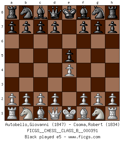 Last move : e5 2026 February 6 16:23:9 White clock - 39 days 13:03:27 Black clock - 39 days 06:09:24 [Event "FICGS__CHESS__CLASS_B__000391"] [Site "FICGS"] [Date "2026.02.05"] [Round "1"] [White "Autobello,Giovanni"] [Black "Csoma,Robert"] [Result "*"] [WhiteElo "1847"] [BlackElo "1834"] 1.e4 e5 2.* Follow this game move after move (download)No other master has such a terrific will to win. At the board he radiates danger, and even the strongest opponents tend to freeze, like rabbits when they smell a panther. Even his weaknesses are dangerous. As white, his opening game is predictable - you can make plans against it - but so strong that your plans almost never work. In the middle game his precision and invention are fabulous, and in the end game you simply cannot beat him. (Anonymous German Expert) Frage des Reporters: -Welche besonderen Umstände rechtfertigen das Anhalten der Uhren während einer Turnierpartie? Antwort: -Einen Fotographen zu strangulieren. (Siegbert Tarrasch) Después de la respuesta de las negras a 1.e4 con 1..e5, se quedan siempre tratando de entrar dentro del juego. (Howard Staunton) Vous savez, camarade Pachman, je n'éprouve pas de plaisir à être ministre, je jouerais plutôt aux échecs comme vous, ou alors ferais une révolution au Venezuela. (Che Guevara à Ludek Pachman, 'Checkmate in Prague', 1975) I'm extremely disappointed. I send you out for exciting, new designer drugs, you come back with tomato sauce. (Gregory House, House M.D.)