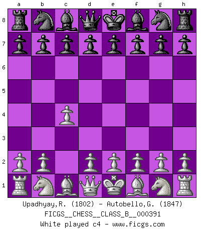 Last move : c4 2026 February 6 2:23:21 White clock - 39 days 14:46:32 Black clock - 39 days 02:50:38 [Event "FICGS__CHESS__CLASS_B__000391"] [Site "FICGS"] [Date "2026.02.05"] [Round "1"] [White "Upadhyay,Rajesh"] [Black "Autobello,Giovanni"] [Result "*"] [WhiteElo "1802"] [BlackElo "1847"] 1.c4 * Follow this game move after move (download)To avoid losing a piece, many a person has lost the game. (Savielly Tartakover) Später, ... hatte ich zunehmend Erfolg in entscheidenden Partien. Vielleicht weil ich eine einfache Wahrheit erkannte: nicht nur ich hatte Angst, auch mein Gegner. (Mikhail Nekhemyevich Tal) El Ajedrez se juega con la mente... ¡no con las manos!. (Renaud y Kahn) Mais l'homme est une créature légère et illogique : semblable au joueur d'échecs, il n'aime que le processus du but à atteindre, non le but lui-même. (Dostoïevsky) It is not true that people stop pursuing dreams because they grow old, they grow old because they stop pursuing dreams. (Gabriel Garcia Marquez)