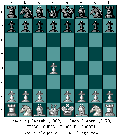 Last move : d4 2026 February 6 2:26:37 White clock - 39 days 14:43:16 Black clock - 39 days 01:23:48 [Event "FICGS__CHESS__CLASS_B__000391"] [Site "FICGS"] [Date "2026.02.05"] [Round "1"] [White "Upadhyay,Rajesh"] [Black "Pech,Stepan"] [Result "*"] [WhiteElo "1802"] [BlackElo "2070"] 1.d4 * Follow this game move after move (download)A man without frontiers. He didn't divide the East and the West, he brought them together in their admiration for him. (Ljubomir Ljubojevic, about Bobby Fischer's death) Ich moechte nie einem Club beitreten, der Leute wie mich als Mitglieder aufnimmt. (Woody Allen) Cuando veas una buena jugada, trata de encontrar otra mejor. (Emanuel Lasker) Pour se monter efficace, un Cavalier a besoin d'avant-postes ! Les Cavaliers font les meilleurs bloqueurs de pions passés. Perception is reality. (Immanuel Kant)