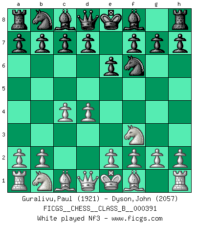 Last move : Nf3 2026 February 6 17:58:3 White clock - 39 days 09:19:53 Black clock - 39 days 06:46:53 [Event "FICGS__CHESS__CLASS_B__000391"] [Site "FICGS"] [Date "2026.02.05"] [Round "1"] [White "Guralivu,Paul"] [Black "Dyson,John"] [Result "*"] [WhiteElo "1921"] [BlackElo "2057"] 1.d4 Nf6 2.c4 e6 3.Nf3 * Follow this game move after move (download)Chess is thirty to forty percent psychology. You don't have this when you play a computer. I can't confuse it. (Judith Polgar) Ich hatte Angst gegen einen russischen Großmeister zu verlieren, und er befürchtete gegen einen kleinen Jungen zu verlieren. (über ein Remis gegen Juri Awerbach). (Robert James Fischer) Puntos débiles o agujeros en la posición de tu oponente deben de ser ocupados por piezas, no Peones. (Siegbert Tarrasch) Assurément je connaissais par expérience le mystérieux attrait de ce jeu royal, le seul entre tous les jeux inventés par les hommes qui échappe souverainement à la tyrannie du hasard, le seul où l'on ne doive sa victoire qu'à son intelligence ou plutôt à une certaine forme d'intelligence. Mais n'est-ce pas déjà le limiter injurieusement que d'appeler les échecs un jeu ? N'est-ce pas une science, un art ou quelque chose qui, comme le cercueil de Mahomet entre ciel et terre, est suspendu entre l'un et l'autre, et qui réunit un nombre incroyable de contraires ? [...] C'est une pensée qui ne mène à rien, une mathématique qui n'établit rien, un art qui ne laisse pas d'uvre, une architecture sans matière; et il l'a prouvé néanmoins qu'il était plus durable, à sa manière, que les livres ou que tout autre monument, ce jeu unique qui appartient à tous les peuples et à tous les temps, et dont personne ne sait quel dieu en fit don à la terre pour tuer l'ennui, pour aiguiser l'esprit et stimuler l'âme. Où commence-t-il, où finit-il ? (Stefan Zweig) Men should grow up. - Yeah. And dogs should stop licking themselves. It's not gonna happen. (Gregory House to Dr. Cameron, House M.D.)
