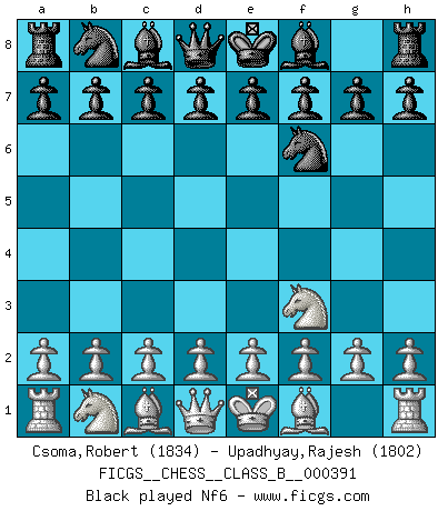 Last move : Nf6 2026 February 6 20:3:15 White clock - 38 days 19:45:29 Black clock - 39 days 20:21:40 [Event "FICGS__CHESS__CLASS_B__000391"] [Site "FICGS"] [Date "2026.02.05"] [Round "1"] [White "Csoma,Robert"] [Black "Upadhyay,Rajesh"] [Result "*"] [WhiteElo "1834"] [BlackElo "1802"] 1.Nf3 Nf6 2.* Follow this game move after move (download)Methodical thinking is of more use in Chess than inspiration. (C. J. S. Purdy) Schach wird sich dank seiner hohen kulturellen Tradition immer durchsetzen. In näherer Zukunft womöglich sogar als Gegenreaktion auf die maßlose Reizüberflutung im Freizeit- und Spielbereich. (Garry Kasparov) Tu puedes aprender mucho mas de una partida que pierdas que de una partida ganada. Tendras que perder cientos de partidas antes de llegar a ser un buen jugador. (Jose Raul Capablanca) Les échecs sont plus proches de l'art de l'assassinat que de l'art de la guerre. (Arturo Perez-Reverte) The only difference between a tax man and a taxidermist is that the taxidermist leaves the skin. (Mark Twain)