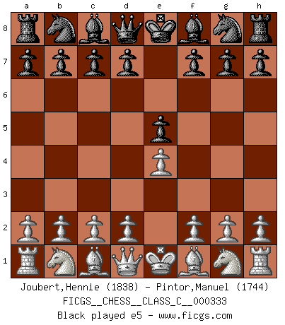 Last move : e5 2026 February 10 15:33:19 White clock - 39 days 16:02:28 Black clock - 39 days 20:08:20 [Event "FICGS__CHESS__CLASS_C__000333"] [Site "FICGS"] [Date "2026.02.10"] [Round "1"] [White "Joubert,Hennie"] [Black "Pintor,Manuel"] [Result "*"] [WhiteElo "1838"] [BlackElo "1744"] 1.e4 e5 2.* Follow this game move after move (download)You can only get good at Chess if you love the game. (Bobby Fischer) Ich verachte die Medien. (Robert James Fischer) En manos de Fischer's, una diminuta ventaja teórica es tan buena como tener una Reina de ventaja. (Isaac Kashdan) Comme les marins qui ont mille raisons différentes d'aller en mer, les joueurs d'échecs en ont tout autant avant de s'installer devant une table et jouer... (Vincent Bertignac, philosophe) Art disturbs, science reassures. (Georges Braque, Le Jour et la Nuit)