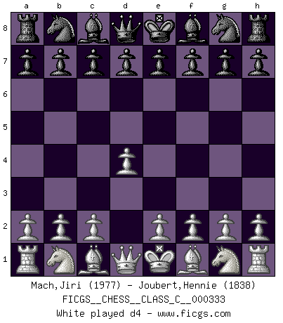 Last move : d4 2026 February 10 23:57:28 White clock - 39 days 10:57:53 Black clock - 39 days 22:08:43 [Event "FICGS__CHESS__CLASS_C__000333"] [Site "FICGS"] [Date "2026.02.10"] [Round "1"] [White "Mach,Jiri"] [Black "Joubert,Hennie"] [Result "*"] [WhiteElo "1977"] [BlackElo "1838"] 1.d4 * Follow this game move after move (download)It is no time to be playing Chess when the house is on fire. (Italian Proverb) Es ist besser die Steine des Gegners zu opfern. (Savielly Grigorievitsch Tartakower) La vida es como el Ajedrez, con lucha, competición y eventos buenos y malos. (Benjamin Franklin) Les Echecs représentent une sphère d'idées créatrices basée sur la volonté des deux protagonistes. (Smyslov) A generalist learns less and less about more and more until he knows nothing about everything. (Author unknown)