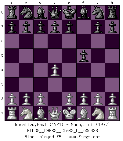 Last move : h4 2026 March 23 10:40:40 White clock - 35 days 06:46:11 Black clock - 3 days 15:52:24 [Event "FICGS__CHESS__CLASS_C__000333"] [Site "FICGS"] [Date "2026.02.10"] [Round "1"] [White "Guralivu,Paul"] [Black "Mach,Jiri"] [Result "*"] [WhiteElo "1921"] [BlackElo "1977"] 1.d4 f5 2.Bg5 h6 3.Bh4 g5 4.e3 Nf6 5.Bg3 d6 6.h4 * Follow this game move after move (download)The enormous mental resilience, without which no Chess player can exist, was so much taken up by Chess that he could never free his mind of this game. (Albert Einstein) Ich erzeugte keinen Neid, da mich die Schachspieler als Musiker und die Musiker als Schachspieler betrachteten. (Mark Taimanov) Realmente no sabemos como el juego fue inventado, aunque hay sospechas. Tan pronto como descubramos a los culpables, se los haremos saber. (Bruce Pandolfini) Les Echecs ont trois composantes : le temps, l'espace et le matériel en dernier. (Mikhail Tal) Luck is what you have left over after you give 100 percent. (Langston Coleman)