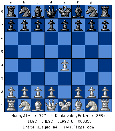 Last move : e4 2026 February 10 23:57:21 White clock - 39 days 10:58:00 Black clock - 39 days 22:08:35 [Event "FICGS__CHESS__CLASS_C__000333"] [Site "FICGS"] [Date "2026.02.10"] [Round "1"] [White "Mach,Jiri"] [Black "Krakovsky,Peter"] [Result "*"] [WhiteElo "1977"] [BlackElo "1898"] 1.e4 * Follow this game move after move (download)Chess is a fighting game which is purely intellectual and includes chance. (Richard Reti) Das Spiel gibt uns die Genugtuung, die das Leben uns versagt. (Emanuel Lasker) Las ideas audaces son como las piezas del Ajedrez que avanzan hacia adelante. Ellas pueden ser vencidas, pero también pueden iniciar una partida victoriosa. (Goethe) Un footballeur joue avec ses pieds, parfois avec sa tête. Un joueur d'échecs ne joue qu'avec sa tête. Et quand il ne joue plus, il meurt. (Jacob Murray) Perhaps the current trend of many chess professionals taking up the more lucrative pastime of poker is not a wholly negative one. It may not be too late for humans to relearn how to take risks in order to innovate and thereby maintain the advanced lifestyles we enjoy. And if it takes a poker-playing supercomputer to remind us that we can't enjoy the rewards without taking the risks, so be it. (The Chess Master and the Computer, by Garry Kasparov - 2010)