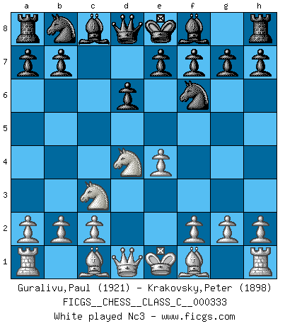 Last move : Nc3 2026 February 10 21:40:21 White clock - 39 days 18:24:23 Black clock - 39 days 14:42:12 [Event "FICGS__CHESS__CLASS_C__000333"] [Site "FICGS"] [Date "2026.02.10"] [Round "1"] [White "Guralivu,Paul"] [Black "Krakovsky,Peter"] [Result "*"] [WhiteElo "1921"] [BlackElo "1898"] 1.e4 c5 2.Nf3 d6 3.d4 cxd4 4.Nxd4 Nf6 5.Nc3 * Follow this game move after move (download)I have never in my life played the French Defence, which is the dullest of all openings. (Wilhelm Steinitz) Jeder leidlich begabte Spieler, er braucht keineswegs hervorragend veranlagt zu sein, kann es zum Meister bringen. Aber das ist ja auch gar nicht nötig! Der richtige Standpunkt ist es, zu seinem Vergnügen zu spielen, und man glaube ja nicht, dass der Genuss proportional dem Können sei. (Siegbert Tarrasch) ¿Que sería del Ajedrez sin errores graciosos?. (Kurt Richter) Les échecs, c'est l'imagination. (David Bronstein) Computer Science is no more about computers than astronomy is about telescopes. (Edsger W. Dijkstra)