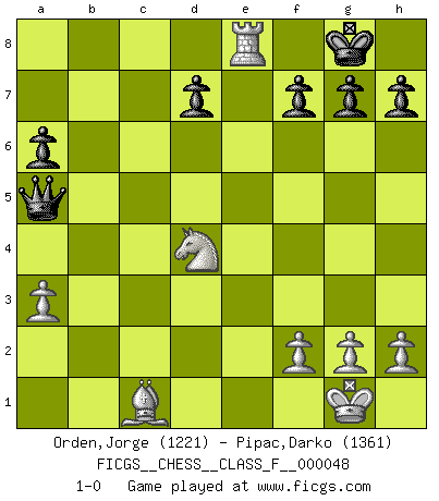 Last move : 1-0 2007 October 25 14:48:15 [Event "FICGS__CHESS__CLASS_F__000048"] [Site "FICGS"] [Date "2007.10.12"] [Round "1"] [White "Orden,Jorge"] [Black "Pipac,Darko"] [Result "1-0"] [WhiteElo "1221"] [BlackElo "1361"] 1.e4 e5 2.Nf3 Nc6 3.Bb5 Bd6 4.O-O Nf6 5.Re1 a6 6.Ba4 b5 7.Bb3 O-O 8.c3 b4 9.a3 bxc3 10.bxc3 Bb7 11.d4 Na5 12.dxe5 Nxe4 13.exd6 Rb8 14.Bd5 Nc5 15.dxc7 Qxc7 16.Bxb7 Qxb7 17.Nbd2 Ncb3 18.Nxb3 Nxb3 19.Rb1 Rfc8 20.Nd4 Rxc3 21.Rxb3 Rxb3 22.Qxb3 Qc7 23.Qc2 Qa5 24.Qe4 Kf8 25.Qe7+ Kg8 26.Qe8+ Rxe8 27.Rxe8+ 1-0 Ruy Lopez (Spanish Opening) Kingside Castling by player White (move 4) Kingside Castling by player Black (move 7) Player White won this chess game. Follow this game move after move (download)Chess is ruthless: you've got to be prepared to kill people. (Nigel Short) Es genügt nicht ein guter Spieler zu sein, man muß auch gut spielen. (Siegbert Tarrasch) Los Peones son nacidos libres, y aún así, se encuentran por doquier encadenados. (Rick Kennedy) Les échecs sont un jeu terrible. Si vous n'avez pas le centre, votre adversaire a une position plus libre. Par contre, si vous avez le centre, alors vous avez vraiment quelque chose pour laquelle vous inquiéter ! (Siegbert Tarrasch) The age of a woman doesn't mean a thing. The best tunes are played on the oldest fiddles. (Ralph Waldo Emerson)
