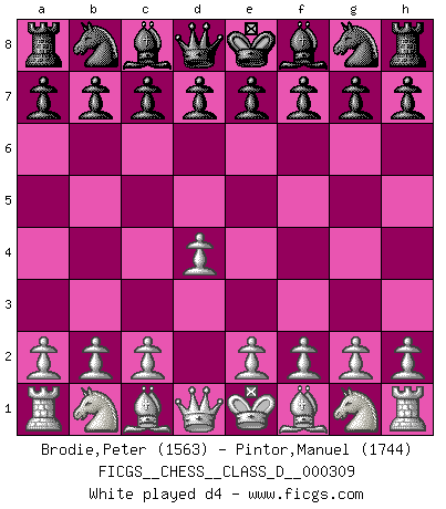 Last move : d4 2026 February 10 19:48:8 White clock - 39 days 22:23:18 Black clock - 39 days 21:03:35 [Event "FICGS__CHESS__CLASS_D__000309"] [Site "FICGS"] [Date "2026.02.10"] [Round "1"] [White "Brodie,Peter"] [Black "Pintor,Manuel"] [Result "*"] [WhiteElo "1563"] [BlackElo "1744"] 1.d4 * Follow this game move after move (download)By playing at Chess then, we may learn: First: Foresight... Second: Circumspection... Third: Caution... And lastly, we learn by Chess the habit of not being discouraged by present bad appearances in the state of our affairs, the habit of hoping for a favorable chance, and that of persevering in the secrets of resources. (Benjamin Franklin) Charakterschwächen offenbaren sich normalerweise während einer Schachpartie. (Garry Kasparov) Debes de llevar a tu oponente hacia un profundo y obscuro bosque donde 2+2=5, y el camino que conduce a la salida es suficientemente ancho para solamente uno. (Mikhail Tal) Shah mat. Le roi est mort. Cri de fierté d'un joueur venant de terrasser son adversaire, courtoisement, sans effusion de sang. In my experience, there's no such thing as luck. (Obi-Wan Kenobi in Star Wars ep.4)