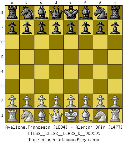 First move 2026 February 10 18:11:26 Francesca Avallone ... is in vacation until 2026 February 18 18:40:59 White clock - 40 days 00:00:00 Black clock - 40 days 00:00:00 [Event "FICGS__CHESS__CLASS_D__000309"] [Site "FICGS"] [Date "2026.02.10"] [Round "1"] [White "Avallone,Francesca"] [Black "Alencar,Ofir"] [Result "*"] [WhiteElo "1804"] [BlackElo "1477"] 1.* Follow this game move after move (download)The Chess pieces are the block alphabet which shapes thoughts; and these thoughts, although making a visual design on the chessboard, express their beauty abstractly, like a poem. (Marcel Duchamp) Ich moechte nie einem Club beitreten, der Leute wie mich als Mitglieder aufnimmt. (Woody Allen) No nos podemos resistir a la fascinación de un sacrificio ya que la pasión por los sacrificios es parte de la naturaleza de un jugador de Ajedrez. (Rudolf Spielman) La tactique, c'est ce que vous faites quand il y a quelque chose à faire; la stratégie, c'est ce que vous faites quand il n'y a rien à faire. (Savielli Tartacower) If you ain't just a little scared when you enter a casino, you are either very rich or you haven't studied the games enough. (Pappy)