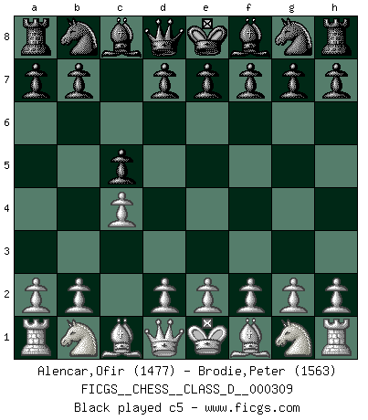 Last move : c5 2026 February 10 19:48:24 White clock - 39 days 20:06:44 Black clock - 39 days 22:30:13 [Event "FICGS__CHESS__CLASS_D__000309"] [Site "FICGS"] [Date "2026.02.10"] [Round "1"] [White "Alencar,Ofir"] [Black "Brodie,Peter"] [Result "*"] [WhiteElo "1477"] [BlackElo "1563"] 1.c4 c5 2.* Follow this game move after move (download)I have always a slight feeling of pity for the man who has no knowledge of Chess. (Siegbert Tarrasch) Obendrein hat der FIDE-Präsident den Revolutionsführer Gaddafi zum »Großmeister« ernannt, am Ende der WM. Das ist lächerlich! (Joel Lautier) Todo se encuentra en un estado de flujo y esto incluye al mundo del Ajedrez. (Mikhail Botvinnik) Psychologiquement, tu dois avoir confiance en toi même, mais cette confiance doit être basée sur des faits. (Robert Fischer) I don't know, I don't care, and it doesn't make any difference. (Albert Einstein)