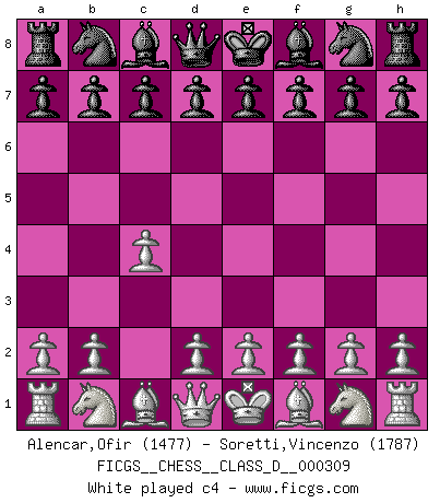 Last move : c4 2026 February 10 18:18:41 White clock - 39 days 23:52:45 Black clock - 39 days 17:08:43 [Event "FICGS__CHESS__CLASS_D__000309"] [Site "FICGS"] [Date "2026.02.10"] [Round "1"] [White "Alencar,Ofir"] [Black "Soretti,Vincenzo"] [Result "*"] [WhiteElo "1477"] [BlackElo "1787"] 1.c4 * Follow this game move after move (download)Chess is in its essence a game, in its form an art, and in its execution a science. (Baron Tassilo) Bogoljubow: Matt in vier Zügen! Tartakower: Ich verbitte mir jede Belästigung! (Savielly Grigorievitsch Tartakower) Un jugador que trata de regresar una movida en el Ajedrez es un futuro carterista. (Richard Fenton) La vérité est comme le meilleur coup aux échecs : elle existe, mais il faut la chercher. (Arturo Perez-Reverte) Now the reason the enlightened prince and the wise general conquer the enemy whenever they move and their achievements surpass those of ordinary men is foreknowledge. (Sun Tzu)