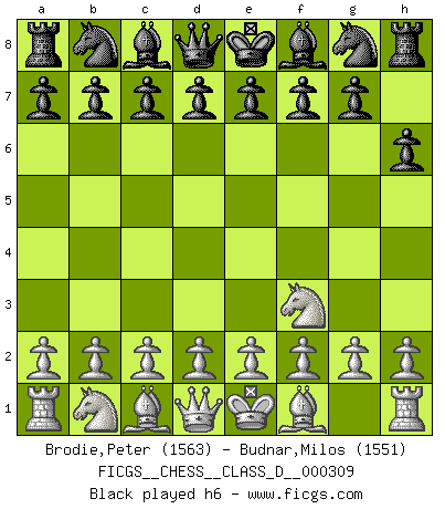 Last move : h6 2026 February 10 21:45:49 White clock - 39 days 20:34:59 Black clock - 39 days 22:01:58 [Event "FICGS__CHESS__CLASS_D__000309"] [Site "FICGS"] [Date "2026.02.10"] [Round "1"] [White "Brodie,Peter"] [Black "Budnar,Milos"] [Result "*"] [WhiteElo "1563"] [BlackElo "1551"] 1.Nf3 h6 2.* Follow this game move after move (download)A great player and a great example for many. His book My 60 Memorable Games had a big impact on me. It is a shame he didn't continue to enrich the world of chess with his unparalleled understanding after 1972. (Jan Timman, about Bobby Fischer's death) Das Zentrum ist der Balkan des Schachbretts - Kriegshandlungen können in jedem Moment ausbrechen. (Aaron Nimzowitsch) Debes de llevar a tu oponente hacia un profundo y obscuro bosque donde 2+2=5, y el camino que conduce a la salida es suficientemente ancho para solamente uno. (Mikhail Tal) Nous sommes les pions de la mystérieuse partie d'Echecs jouée par Dieu. Il nous déplace, nous arrête, nous pousse encore, puis nous lance un à un dans la boîte du Néant. Epitaphe sur la tombe de David Janowsky (1868-1927). If only faces could talk... (Pat Summerall, Sportscaster during the Super Bowl)