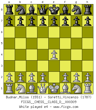 Last move : e4 2026 February 10 21:46:3 White clock - 39 days 20:25:23 Black clock - 39 days 20:36:04 [Event "FICGS__CHESS__CLASS_D__000309"] [Site "FICGS"] [Date "2026.02.10"] [Round "1"] [White "Budnar,Milos"] [Black "Soretti,Vincenzo"] [Result "*"] [WhiteElo "1551"] [BlackElo "1787"] 1.e4 * Follow this game move after move (download)The defensive power of a pinned piece is only imaginary. (Aaron Nimzovich) Frage: Wie viele Autos haben Sie schon zerstört? - Antwort: Nur zwei. (Loek van Wely) Un entendimiento a fondo de las continuaciones típicas del mate, hace de las combinaciones de sacrificio mas complicadas conducirlas a ellas no solo sin dificultad, sino casi de una manera natural. (Siegbert Tarrasch) Soyez une menace à chaque fois que vous vous asseyez pour jouer. (Ken Smith) Every man's memory is his private literature. (Aldous Huxley)