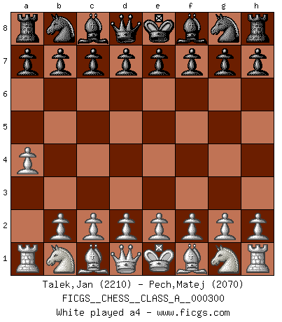 First move 2026 February 15 9:26:30 White clock - 39 days 10:34:53 Black clock - 40 days 00:00:00 [Event "FICGS__CHESS__CLASS_A__000300"] [Site "FICGS"] [Date "2026.02.15"] [Round "1"] [White "Talek,Jan"] [Black "Pech,Matej"] [Result "*"] [WhiteElo "2210"] [BlackElo "2070"] 1.* Follow this game move after move (download)The passion for playing Chess is one of the most unaccountable in the world. (H.G. Wells) Kostenjuk hat keinen Sexappeal. (Loek van Wely) Bobby Fischer es el jugador de Ajedrez mas grande que jamás haya existido. (Ken Smith) On peut tirer plus d'utilité d'une partie perdue que de 100 parties gagnées. (Capablanca) The mind is like a parachute, it only functions when its open. (Unknown)