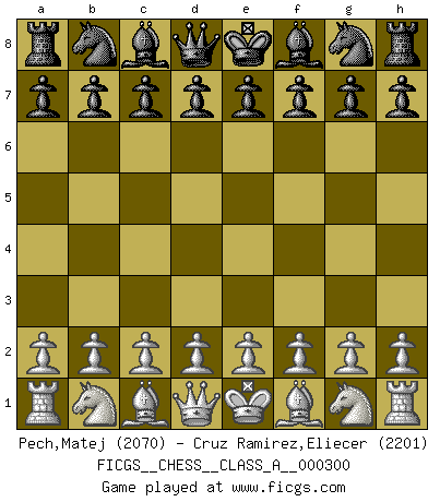 First move 2026 February 15 9:26:30 White clock - 39 days 10:34:53 Black clock - 40 days 00:00:00 [Event "FICGS__CHESS__CLASS_A__000300"] [Site "FICGS"] [Date "2026.02.15"] [Round "1"] [White "Pech,Matej"] [Black "Cruz Ramirez,Eliecer"] [Result "*"] [WhiteElo "2070"] [BlackElo "2201"] 1.* Follow this game move after move (download)Chess is a foolish expedient for making idle people believe they are doing something very clever when they are only wasting their time. (George Bernard Shaw) Schach ist das schnellste Spiel der Welt, weil man in jeder Sekunde Tausende von Gedanken ordnen muß. (Albert Einstein) Aquel que ve no otra dirección en el juego que la de dar Jaque Mate a su oponente, nunca será un buen jugador de Ajedrez. (Euwe) Le pion, dans sa simplicité, marche droit devant lui, mais lorsqu'il prend, il le fait obliquement? Ainsi l'homme, tant qu'il reste pauvre, marche dans la droiture et vit honnêtement, mais lorsqu'il recherche les honneurs, il flatte, se parjure et, par les voies obliques, cherche une position supérieure sur l'échiquier du monde. (Jean de Galles) The difference between perseverance and obstinacy is that one comes from a strong will, and the other from a strong won't. (Henry Ward Beecher)